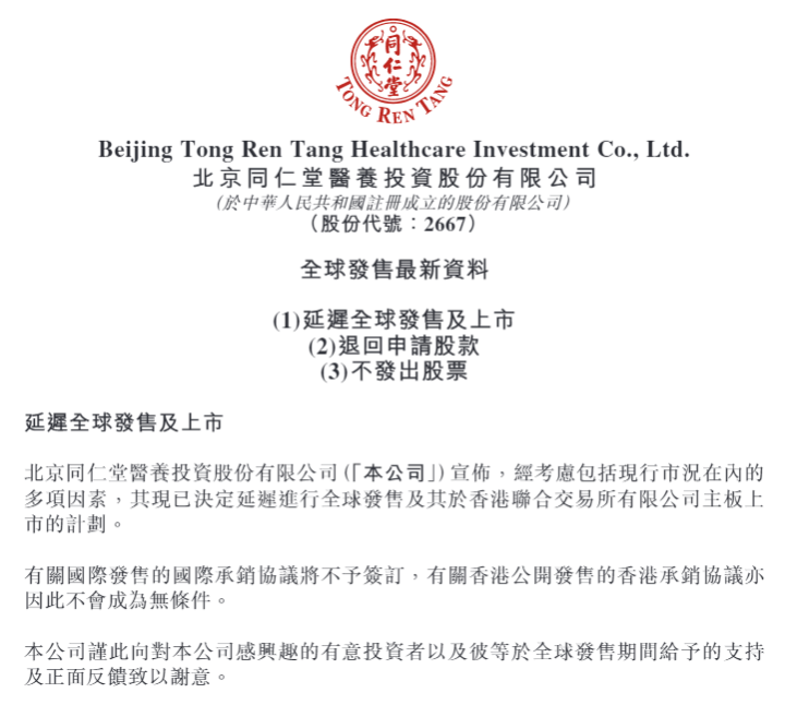 同仁堂医养暗意,相关外洋发售的外洋承销合同将不予执意,相关香港公征战售的香港承销合同亦因此不会成为无要求。但其暗意,公司仍尽力于当令完周到国发售及上市。