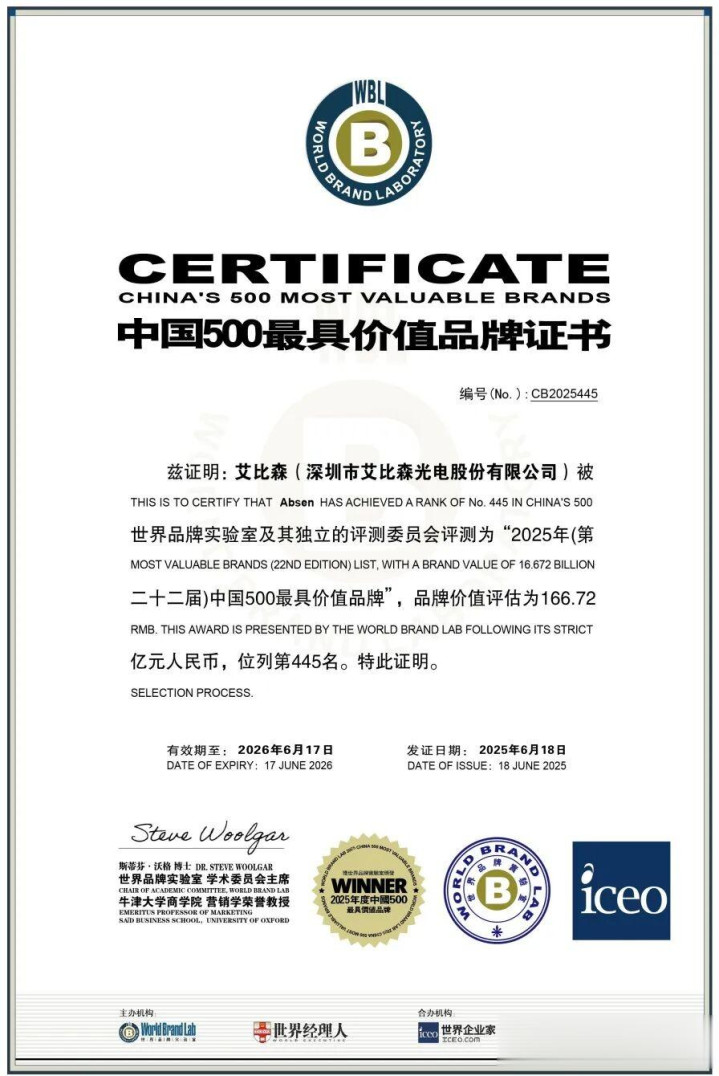 同期,艾比森品牌价值得回国际招供,先后斩获纠合国工发组织“国际信誉品牌”与“品牌建立标杆企业”双重认证,并荣获“2025回顾彼得·德鲁克中国经管奖”、德勤“中国格外经管公司”盛誉,品牌价值攀升至166.72亿元,再度入选“中国500最具价值品牌”,大发秀雅着其大家品牌影响力进入新阶段。