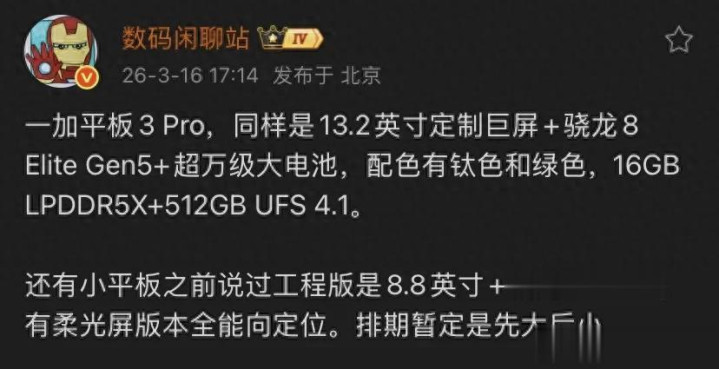 · 一加平板3 Pro配备13.2英寸清楚屏、骁龙8 Elite Gen5芯片、16GB LPDDR5X内存和512GB UFS 4.1存储
