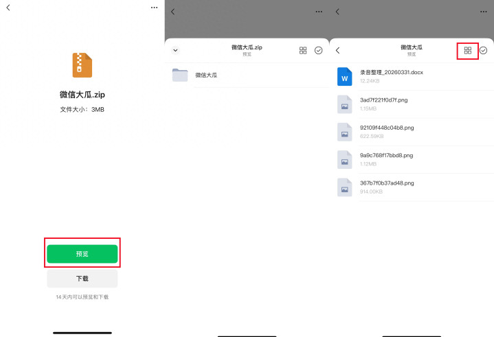 在微信中收到压缩包文献时,用户遴荐“预览”,无需将通盘这个词压缩包下载得手机土产货,即可径直在聊天界面中搜检压缩包内的文献列表和文献本体。