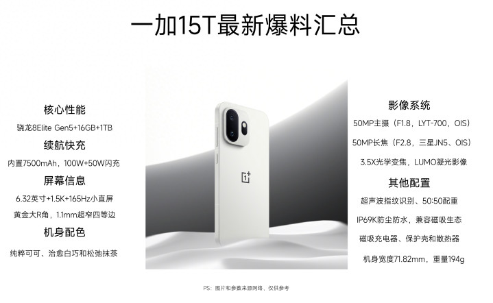 一加15T参数澈底曝光,不单是是现在续航最强的性能旗舰,同期在影像系统和外围建设上也有不少的惊喜。即使和现在的影像旗舰比拟,一加15T也有我方的特质和上风,心爱小屏旗舰的小伙伴千万不要错过了。从现在的预热和爆料来看,一加15T约略率会在3月底发布,以下是该机的详备内容。