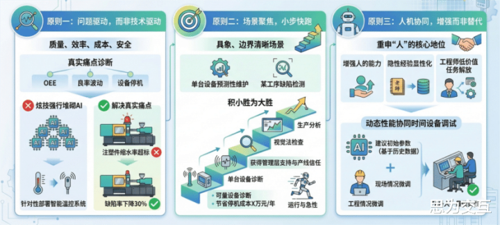 总结制造业现实:质地、收尾、资本、安全。让产线的确痛点(如OEE低下、良率波动、建设停机)牵引技艺哄骗,而非为了“炫技”强行堆砌AI。举例,某企业聚焦“注塑件缩水率超标”问题,针对性部署智能温控系统,兑现转折率着落30%。