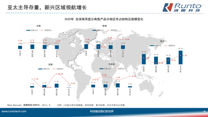 从地域样式看,外洋市集扩大了最初上风;亚太地区主导存量市集,在LED浮现屏、商用投影、数字标牌、交互平板等品类中的限制占比均居首位;中东非等新兴区域则增速最初,主要受益于政府主导的大型动作、经济多元化战术及各行业数字化开采需求。从运用场景看,会议市集等细分领域需求逆势爆发。从本事演进看,COB、MiP等微间距LED浮现本事保握了高增长态势。
