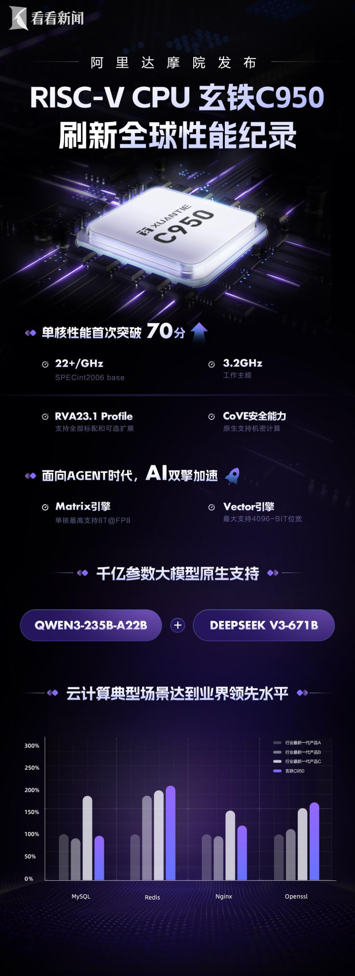 3月24日,在上海举行的2026玄铁RISC-V生态大会上,阿里巴巴达摩院发布新一代旗舰CPU居品玄铁C950。其给与开源RISC-V架构,单核通用性能在SPECint2006基准测试中冲突70分,刷新巨匠RISC-VCPU性能记载,适用于云缠绵、生成式AI、高端机器东说念主、旯旮缠绵等限制,性能达到业界普及水平。