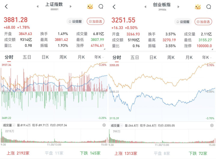 至收盘,上证综指涨1.78%,报3881.28点;科创50指数涨2.33%,报1290.79点;深证成指涨1.43%,报13536.56点;创业板指涨0.5%,报3251.55点。