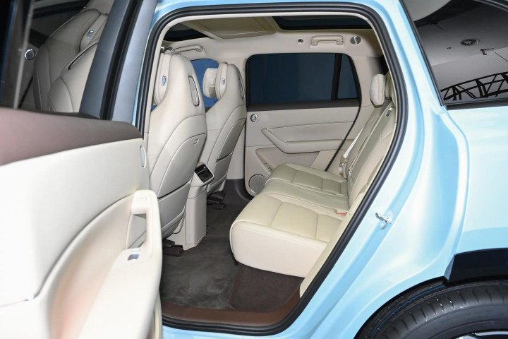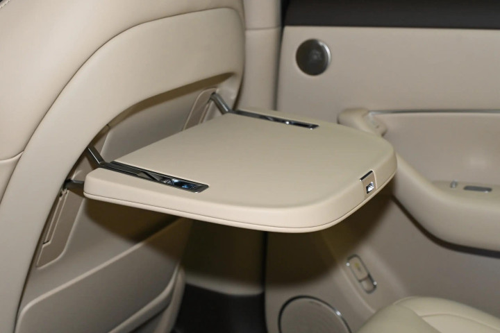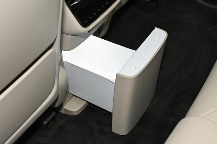 新车后排主打空闲性,小桌板、雪柜和吸顶屏皆是配备的,但八成率是高配车型才会有。