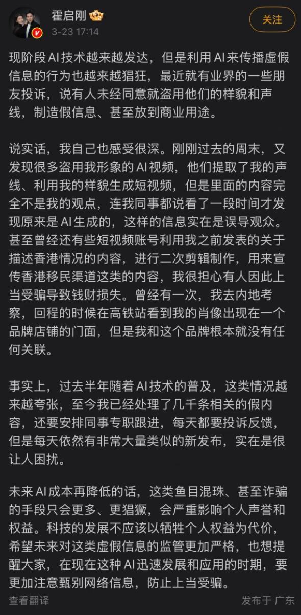 看成权门贵令郎+公世东谈主物的代表,霍启刚平常行事一向矜重高洁,效果就这么一个世界东谈主民齐领略的名东谈主,也被AI黑产给盯上了。