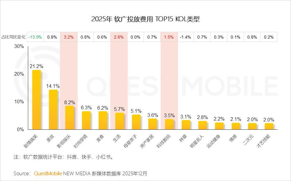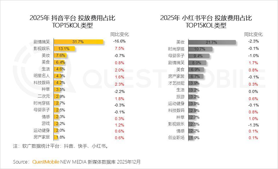 QuestMobile数据显露,dafa大发手机版app2025年,抖音平台中,告白主将更多预算投放至影视文娱、生计、科技数码等达东说念主;小红书平台中,告白主投放结构变化不大。