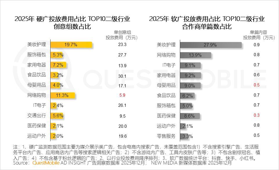 好意思妆行业用高质、无数的硬软广构建全域壁垒,双端有余式投放;而不同于居品力种草,衣饰、食物等行业,更依赖于代言东说念主的“形象溢价”,则聘用大创意道路,对高频次、广躲闪的硬广最大化代言东说念主权利,在软广种草上更克制;网罗购物行业则主打素材堆量、低老本高频试错策略。