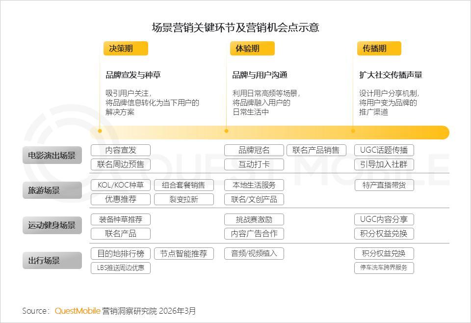 如典型线下场景(电影/演唱会、旅游、清醒、出行等),品牌可通过特色场景特定节点,触达指标东说念主群,达成编削、复购、心智占领的三重指标。