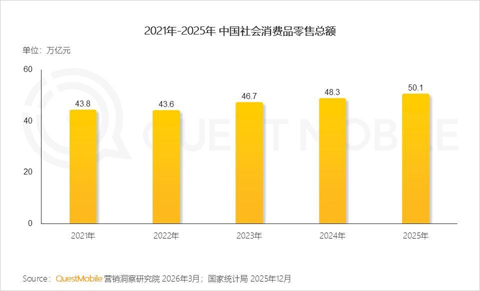 “十四五”时候,社会破费品零卖总数先后迈进40万亿元、50万亿元新台阶。2025年,社会破费品零卖总数达50.1万亿元,同比增长3.7%。
