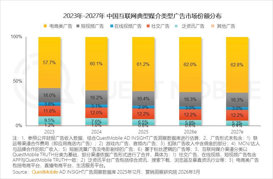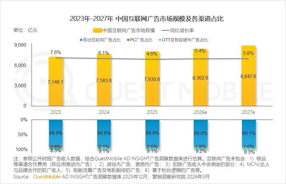今天给全球共享一下2025年中国营销商场年度敷陈。QuestMobile数据显露,曩昔三年,跟着关系部门捏续鼓吹平台经济与算法监管、数据安全与秘密保险,互联网营销的发展日趋健康,界限和韧性都得到了权贵普及,互联网告白商场界限从2023年的7146.1亿元增长至2025年的7930.8亿元,预测2026年、2027年将鉴别达到8362.6亿元、8847.6亿元。