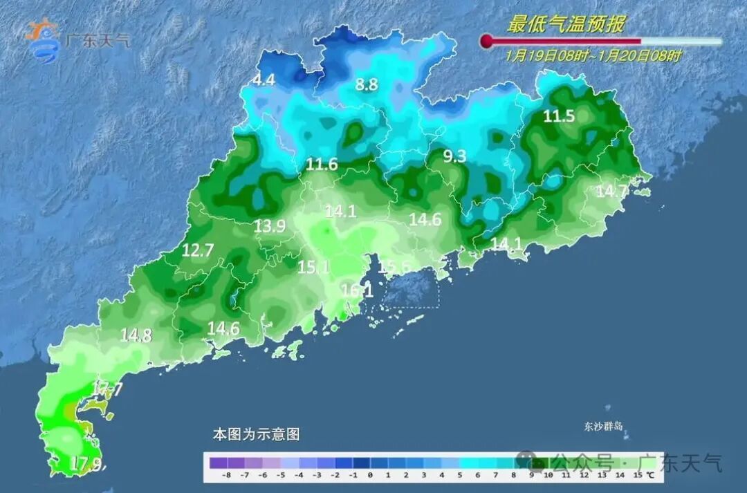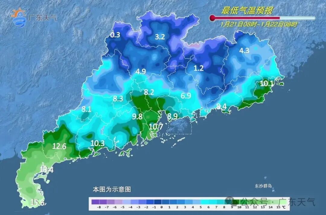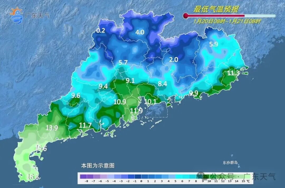 瞻望此次冷空气流程平均气温着落幅度:粤北着落7~10℃,中辖着落5~7℃,南部沿海着落3~5℃。其中粤北21-23日有大界限5℃以下低温,高海拔山区-4~0℃,并伴有雨夹雪或冻雨。本轮冷空气影响下的最低气温瞻望出当今22日前后。