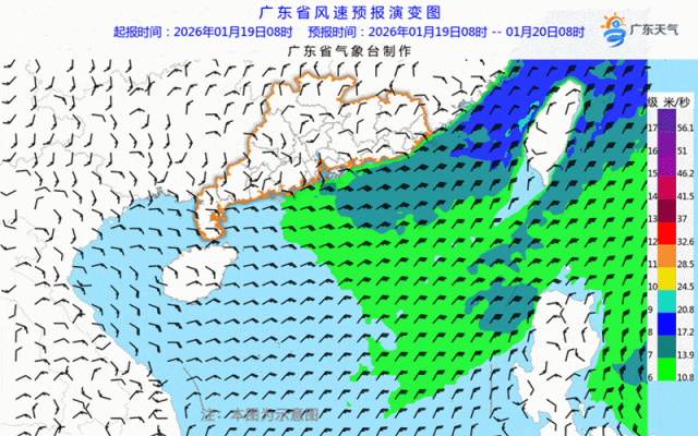 20-21日,粤东海面东北风7级阵风8级,中西部海面东北到东风5-6级阵风7级,台湾海峡、巴士海峡、南海东北部海面东北风7-8级阵风9级。