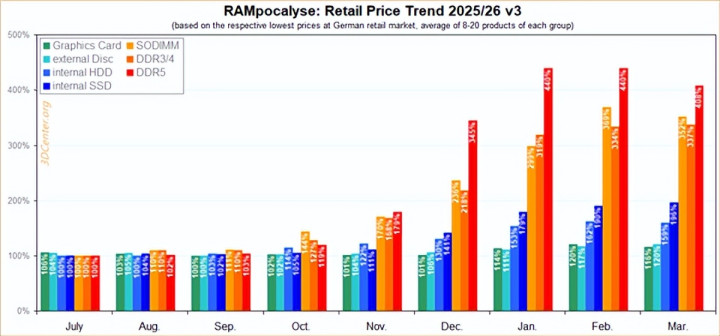 不外,3DCenter跟踪的德国内存阛阓行情久了,本年3月份,20款DDR5内存的平均价钱比上月缩小了7.2%,部分居品致使达到了10%。