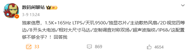 据着名博主@数码闲聊站 爆料:“独家书息,1.5K+165Hz LTPS✓天玑9500✓独显芯片✓主动散热电扇✓2D视觉四等边✓8起头大电板✓相对大尺寸马达✓定制调音对称双扬✓超声波指纹✓IP68✓这建树够不够全乎”。