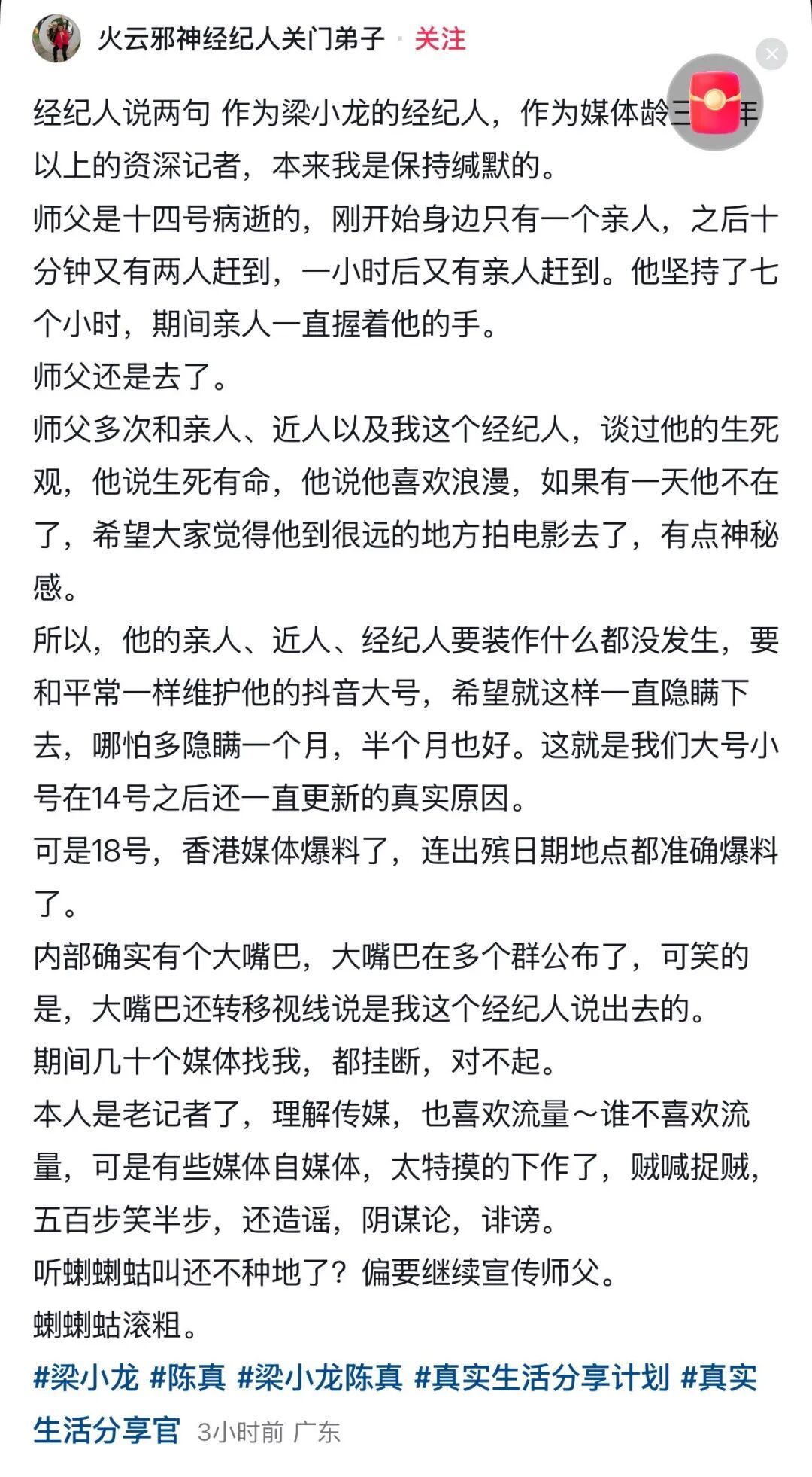 梁小龙短视频账号还在更新。图/短视频账号截图