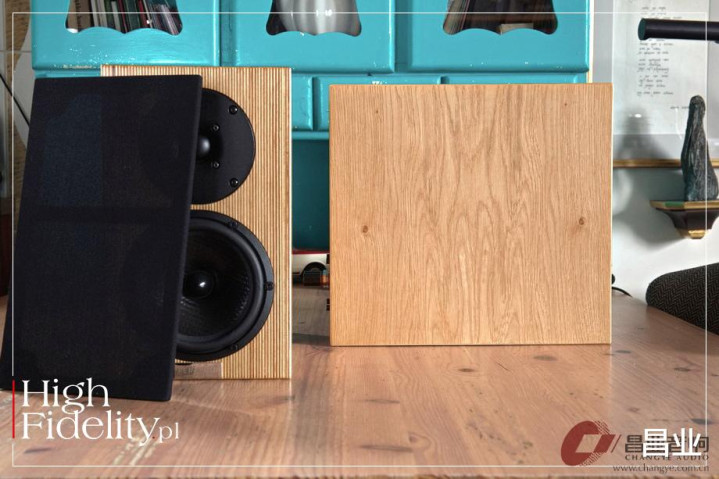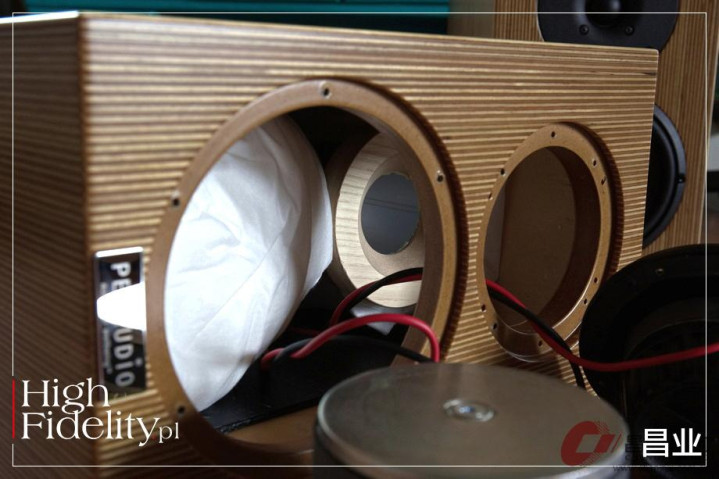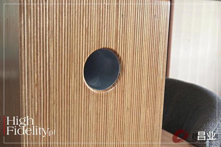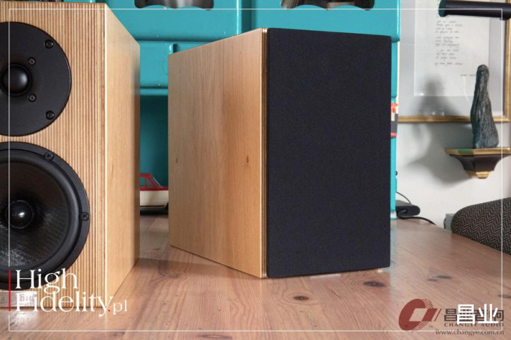低音反射系统也很真谛。它是一根金属管,在箱体内侧终局有一个胶合板元件,带有成型的端口。据我臆测,这是为了减少空气流动的湍流。里面填充了损耗性吸音材料,侧壁上贴有沥青垫,这让我思起了经典的 BBC LS3/5a 监听音箱。随箱附赠装配好的网罩,网罩框架上绷有经典布料。音箱看起来棒极了。