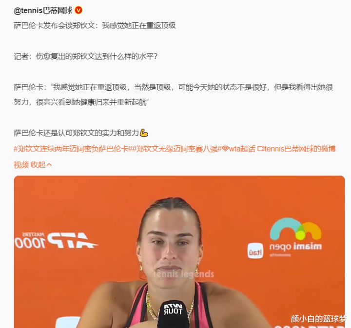 北京时分3月24日凌晨,WTA迈阿密站1000+赛1/8决赛,萨巴伦卡(头号种子)6-3、6-4打败(23号种子)郑钦文晋级八强,换言之郑钦文停步迈阿密站的16强,郑钦文面临寰球第一萨巴伦卡的战绩改写为1胜8负。