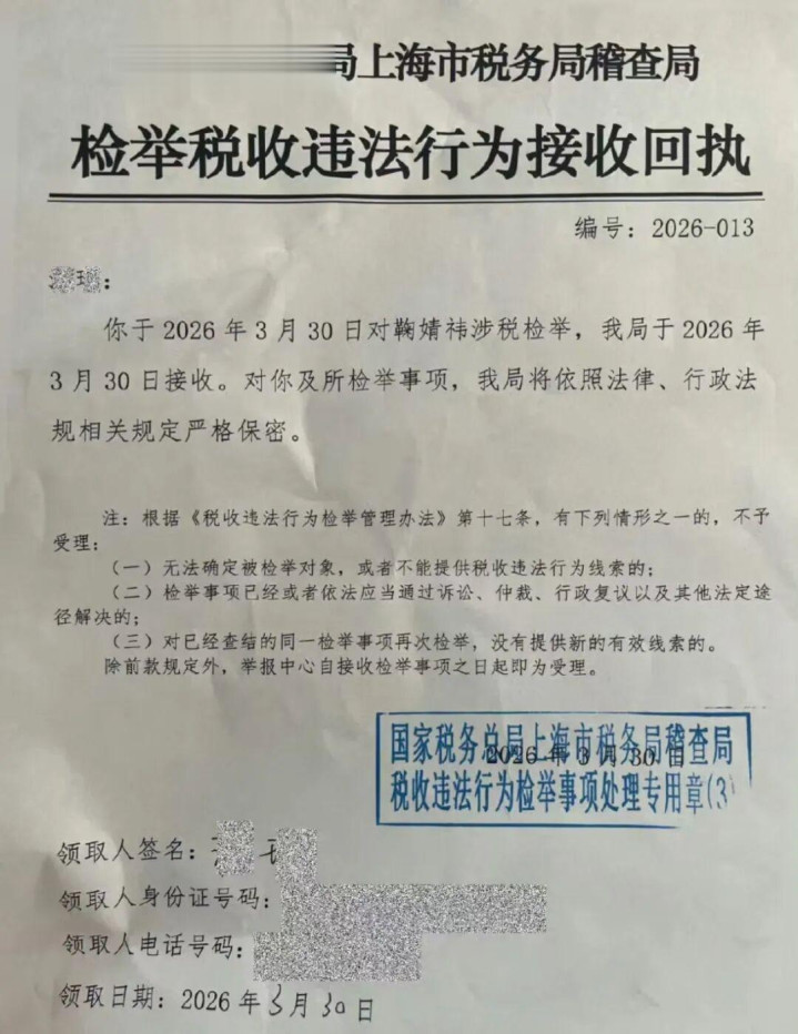 该举报信领取日历为2026年3月30日,信上形色鞠婧祎文书1100万元,骨子收入超5000万元,瞒报比例稀薄85%。