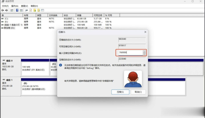压缩的时候输数字至极容易错。我认为输“念念给C盘的大小”,成果输错了,D盘平直少了一半空间,幸好没存伏击东西。自后才懂:输的是“D盘要留若干”,不是“给C盘若干”。比如D盘整个500GB,我念念留300GB,就输307200(单元是MB),不是200GB。这个数得算,计较器按半天。