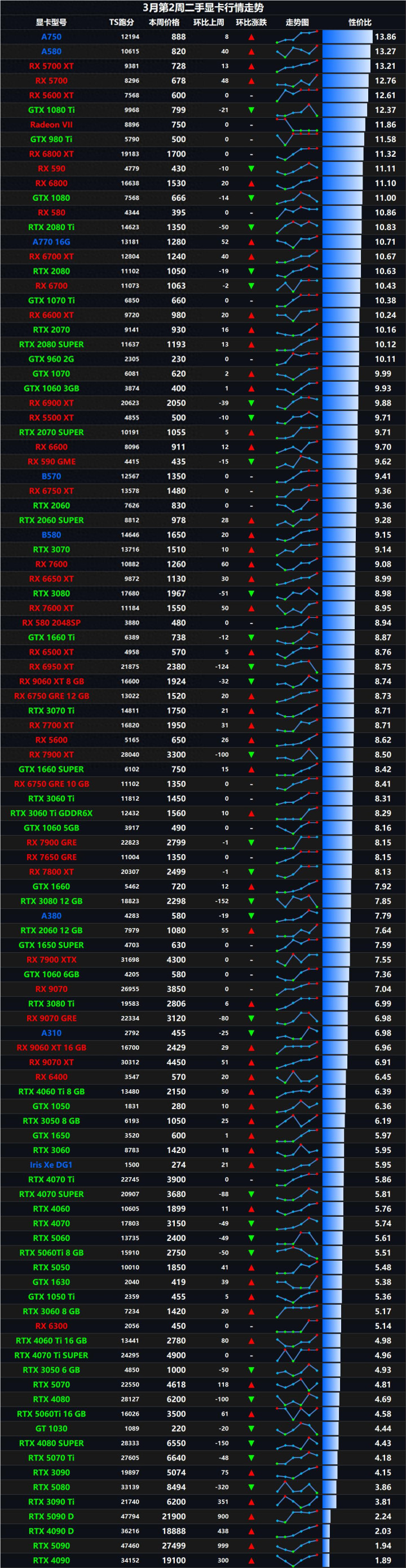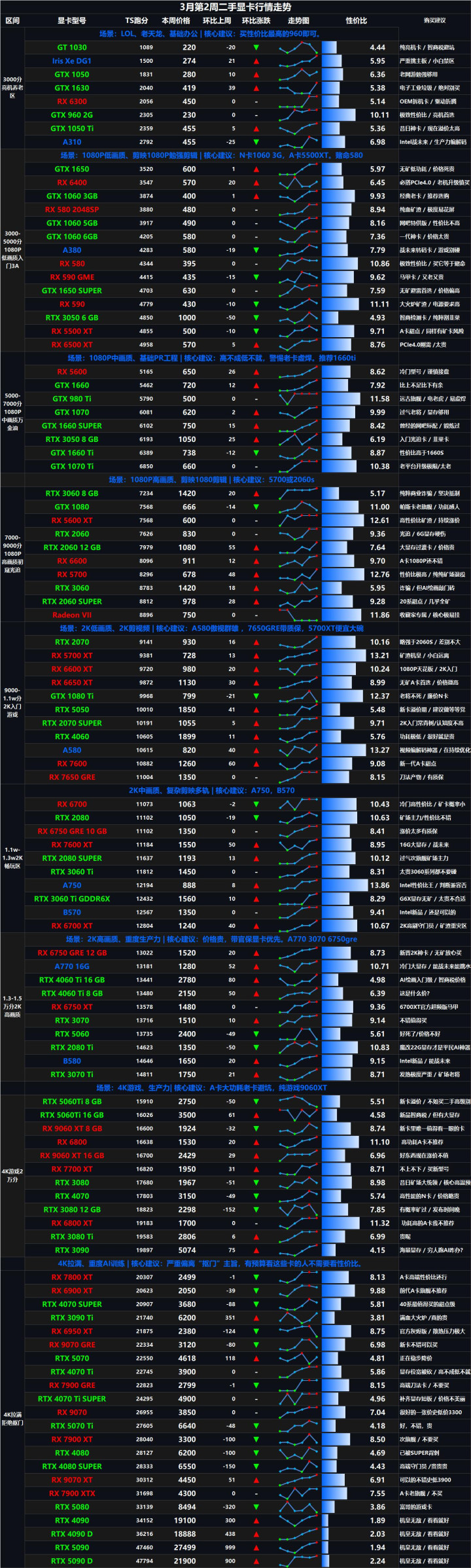 统共的显卡具体排位,我皆整理在内外了Dafabet,思要不踩坑,老规矩,去老方位拿这周最新的【性价比散点图】和天梯图,买二手前务必两张图对照着看。全系显卡和CPU二手行情,每周皆会更新,有需要可握续良善